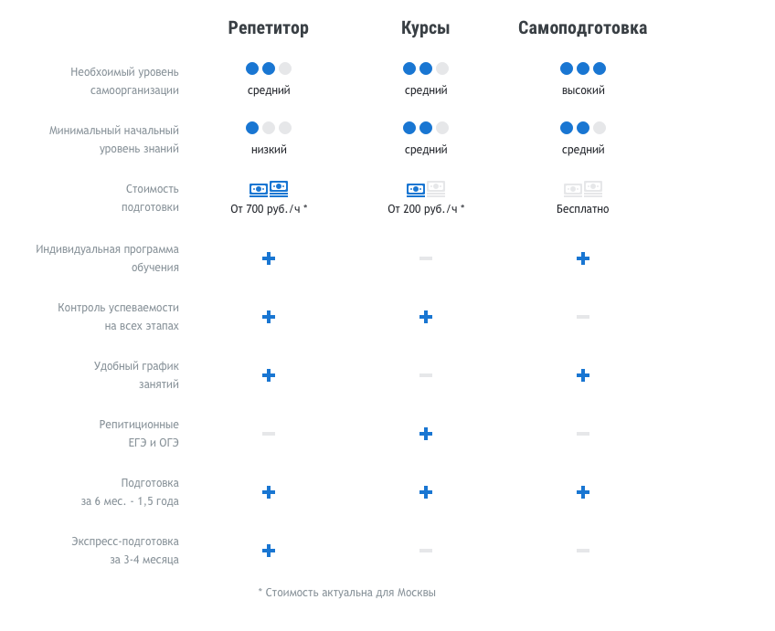 Еще один плюс — это комфортная обстановка во время занятий, школьник сам определяет, где и как ему удобно заниматься: очно у репетитора, очно у себя дома или дистанционно по Skype. Ну и конечно же график обучения — в случае с репетитором он может быть любым. Вы сами выбираете периодичность занятий в зависимости от вашего уровня знаний и желаемых результатов, а также комфортное время урока и его длительность. Чем меньше времени осталось до экзамена, тем чаще придется заниматься, возможно даже каждый день.